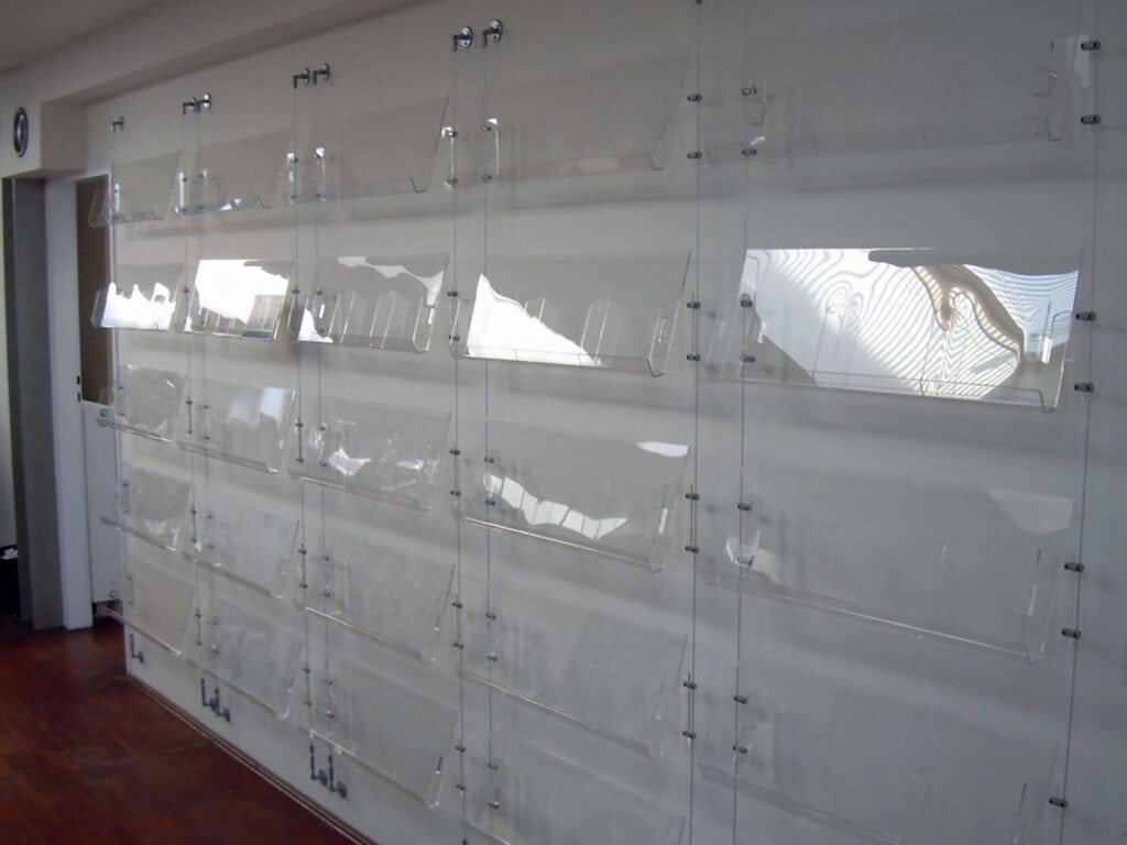 - Kieszenie z pleksi na ulotki – pojemniki do ekspozycji ulotek w formatach A4, A5, A6 i DL, stosowane w recepcjach i punktach informacyjnych.