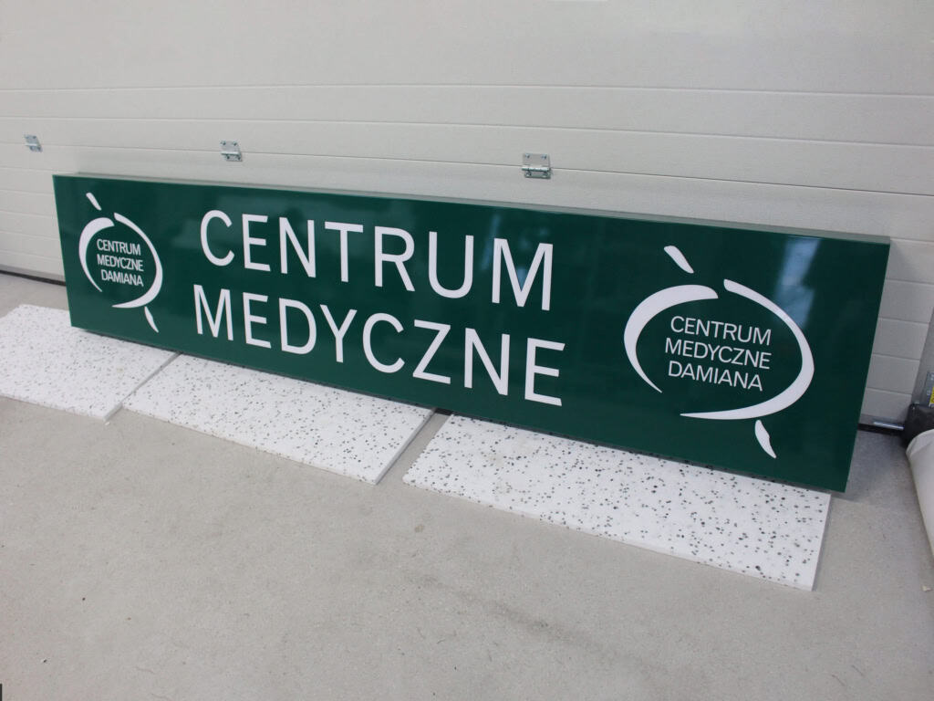 Dla centrum medycznego rekomendujemy kaseton z dibondu lub aluminium z podświetleniem LED. Materiały te są trwałe, eleganckie i odporne na warunki atmosferyczne. Jasna kolorystyka (biel, błękit, zieleń) buduje zaufanie i profesjonalny wizerunek placówki.