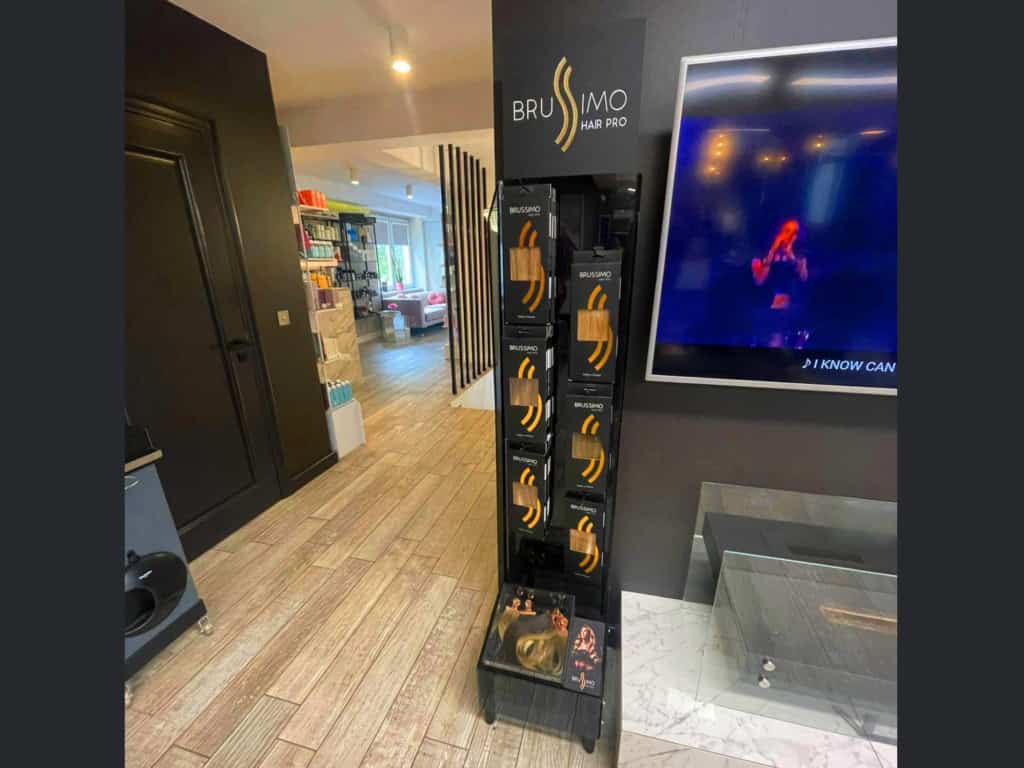 Plexi dymiona (przyciemniona) stanowi neutralne, ciemne tło, które nie odwraca uwagi od eksponowanych włosów. Kolory włosów — od blondu po czerń — wyglądają na dymionej plexi naturalnie i atrakcyjnie, co ułatwia klientom wybór.